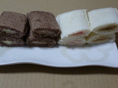 白いパンにはストロベリークリームとキャラメルクリーム、ココア風味のパンにはバナナクリームとアーモンドクリームをサンドして不二家「ルック ア・ラ・モード」をイメージしました。