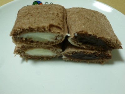 白いパンにはミルクチョコクリームとイチゴチョコクリーム、ココア風味パンにはビターチョコクリームとホワイトチョコクリームをサンドしました。