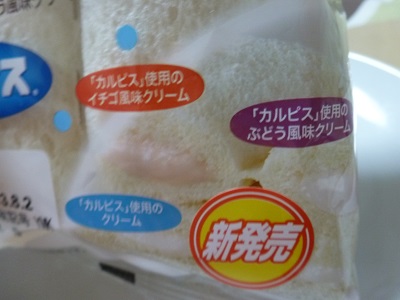 「カルピス」使用のクリーム、「カルピス」使用のイチゴ風味クリーム、「カルピス」使用のぶどう風味クリームをサンドしました。