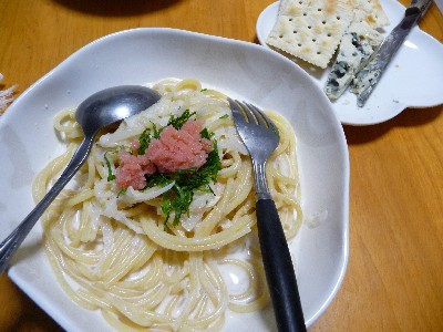 たらこのミルクスパゲティ:569kcal (スパゲティ、たらこ、玉ねぎ、しそ、牛乳、バター)