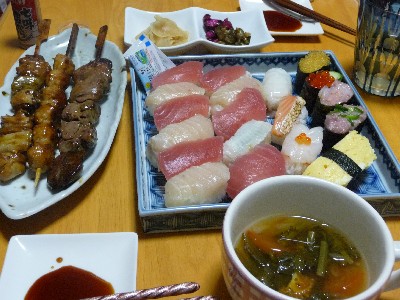 (キハダ鮪5貫、トロびんちょう4貫、えび、いか、ねぎとろ軍艦、とびっこ軍艦、玉子)