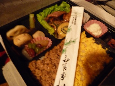 (そぼろごはん、豚生姜焼、エビチリ、煮物〔ハス・里芋〕、三色豆、柴漬け)