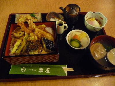 (ごはん、活き巻車海老、なす、かぼちゃ、そらまめ、いんげん、れんこん、丼たれ)