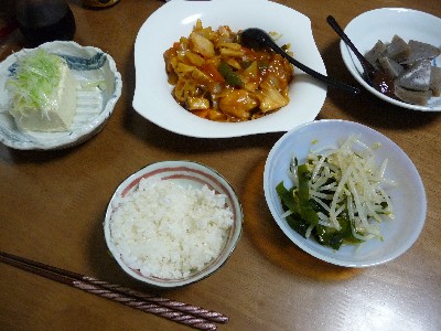 酢鶏:405kcal(からあげ、玉ねぎ、人参、ピーマン、エリンギ、たけのこ、れんこん、ごぼう、甘酢)
