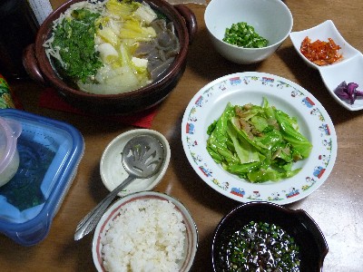(鶏手羽元2本、木綿豆腐、こんにゃく、白菜、大根、長ねぎ、春菊、えのき、ポン酢、小ねぎ)