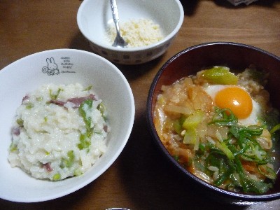 キムチ雑炊:325kcal (ごはん、玉子、キムチ、長ねぎ、大根、キムチ鍋のだし)