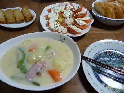 (ハム、じゃがいも、玉ねぎ、人参、スナップエンドウ、シチュールー、牛乳、バター、コンソメ)