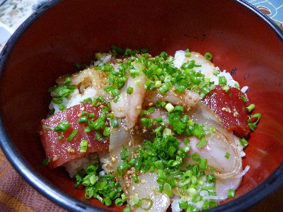 海鮮漬け丼:440cal(ごはん、まぐろ、いか、たい、甘海老、漬けだれ)