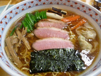 (中華麺、スープ、鴨ロースあけぼの煮、鴨ワンタン、焼長ねぎ、わけぎ、にんじん、メンマ、のり)