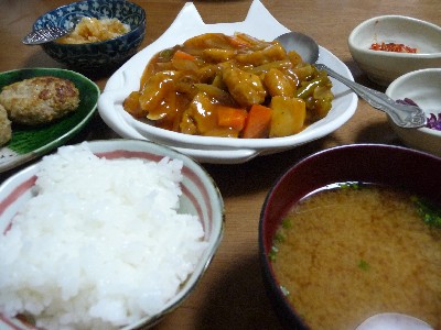 酢豚:373kcal (豚ロース肉、玉ねぎ、ピーマン、人参、れんこん、調味料...etc)