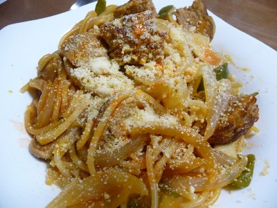 (スパゲティ100g、ハンバーグ、玉ねぎ、ピーマン、エリンギ、