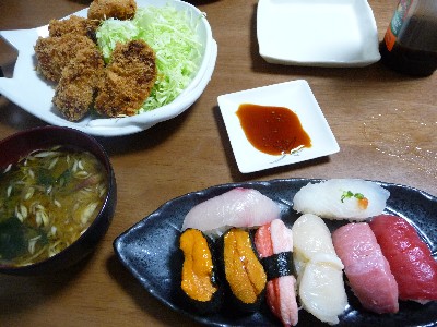 寿司@三越:411kcal (大トロ、赤身、ほたて、かに、うに2貫、ひらめ、はまち)