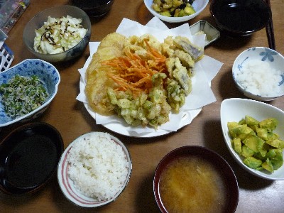 (玉ねぎ、れんこん、人参、なす、にんにく、イカと帆立・長芋と長ねぎのかき揚げ)