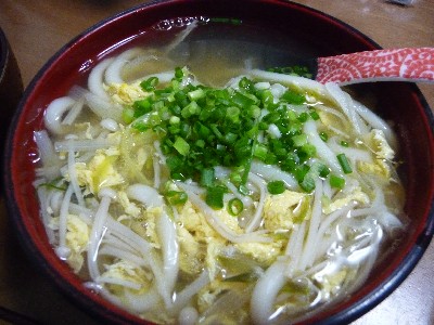 たまごとねぎの薄味うどん:340kcal (うどん、だし、たまご、長ねぎ、えのき、みょうが、めんつゆ)