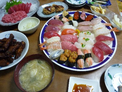 寿司:568kcal (大トロ2、まぐろ2、かに2、うに2、えび2、すずき)