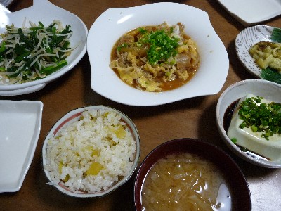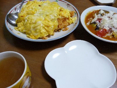 ロースカツの卵とじ:225kcal (ロースカツ 2.5切、たまご、玉ねぎ、調味料...etc)