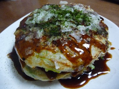 (お好み焼き粉〔356kcal〕、キャベツ、長ねぎ、もやし、長芋、揚げ玉、サラダ油、ソース、パルミジャーノ)