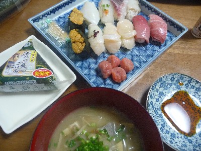 寿司:299kcal (うに、芽ねぎ2、まぐろ、ほたて、中トロ)