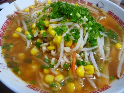 (サッポロ一番みそ〔451kcal〕、もやし、キムチ、コーン、小ねぎ、酢、ラー油、バター)