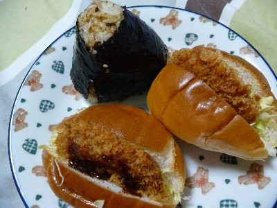 カツサンド2個:343kcal (ロースパン2個、一口カツ@まい泉1個、キャベツ、ソース)