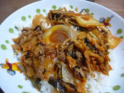 豚キムチごはん:544kcal (ごはん200g、豚キムチ野菜炒め、煮玉子1/2個)