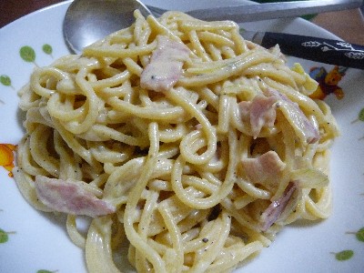 (スパゲッティ、ベーコン、玉ねぎ、ゴルゴンゾーラ、パルメザン、卵黄、牛乳...etc)