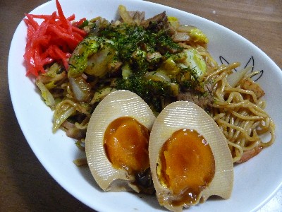 (焼きそば、豚小間切れ肉、煮玉子、かまぼこ、キャベツ、ピーマン、玉ねぎ、エリンギ、油...etc)