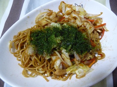 焼きそば:450kcal (焼きそば〔281kcal〕、キャベツ、玉ねぎ、人参、エリンギ、ごま油、青海苔)