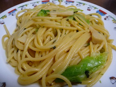 (スパゲッティ、うに風味スパゲッティの素、レタス、エリンギ、バター、牛乳)