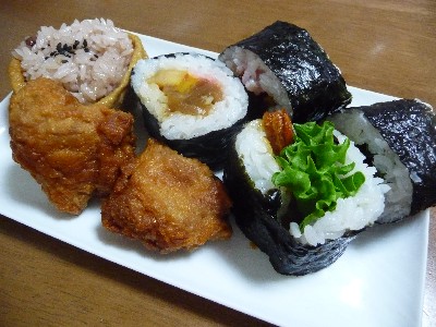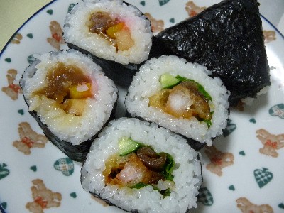 田舎巻 2つ:122kcal (酢飯、海苔、たくわん、筍、かんぴょう、でんぶ)