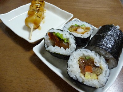 田舎巻 3つ:245kcal (酢飯、海苔、卵、しいたけにんじん、きゅうり、ごぼう干ぴょう)