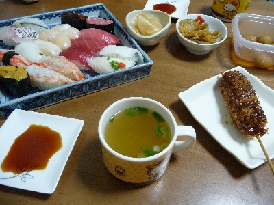 寿司 10貫:540cal (穴子、いか、げそ、えび、まぐろ、ビントロ2貫、いくら、サーモン、はまち)