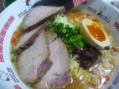 (サッポロ一番みそ1/2袋、煮豚、煮玉子、キャベツ、もやし、玉ねぎ、