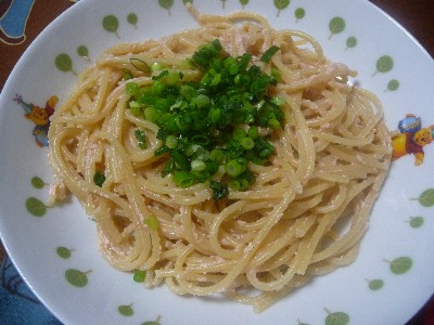 たらこスパゲッティ:525kcal (スパゲッティ、明太子、たらこほぐし、牛乳、バター、小ねぎ)