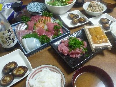 刺し身 :374kcal (まぐろ4切、中落ち、いか2切、はまち1切、甘エビ1尾、うに2切)