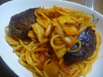 (スパゲッティ、ハンバーグ、玉ねぎ、エリンギ、バター、ケチャップ)