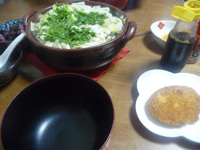 鶏鍋:320kcal(鶏手羽元2本、豆腐、春雨、白菜、ねぎ、しめじ、エリンギ、春菊、ポン酢)