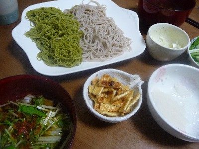 (そば、そうめん、きのこつゆ〔なめこ、えのき、エリンギ〕、油揚げ、長ねぎ、水菜、大根おろし)