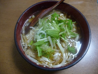 (玉うどん、きのこつゆ〔なめこ、えのき、エリンギ、大根おろし〕、長ねぎ、水菜)