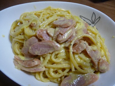 (スパゲティ、ソーセージ、玉ねぎ、卵黄、牛乳、パルメザンチーズ、バター...etc)