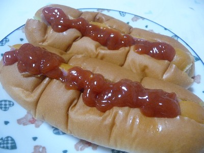 (ホットドッグロール〔135kcal〕、フランクフルトソーセージ2本、ピクルス、玉ねぎ、ケチャップ)