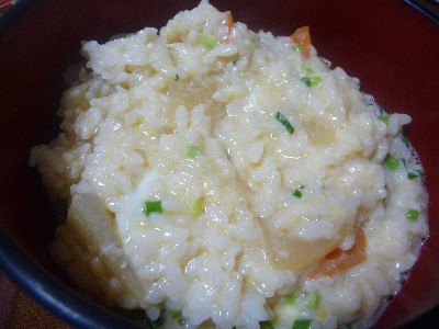 おじや:540kcal (ごはん220g、大根と人参のみそ汁、たまご、小ねぎ、ラー油、酢、ポン酢)