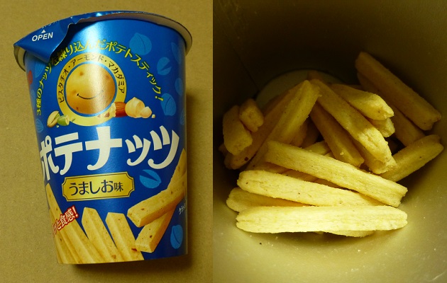 3種類のナッツ(ピスタチオ、アーモンド、マカダミア)を練り込み、カリッとした食感に仕上げたスティックタイプのポテトスナック「ポテナッツ・うましお味」です。