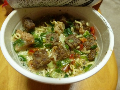 かやくを麺の上に入れてお湯を注いで3分・・・液体ソースを入れてかき混ぜる。