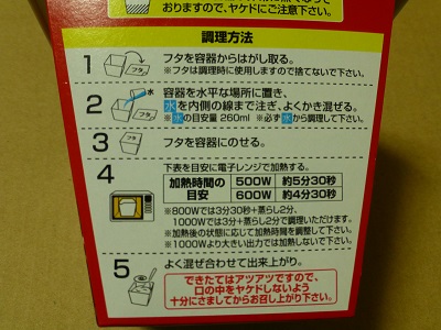 ④電子レンジで加熱する(箱の側面に加熱時間の目安表有り)