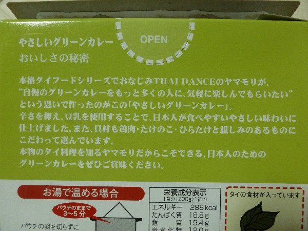 本格タイフードシリーズでおなじみのTHAI DANCEのヤマモリが、“自慢のグリーンカレーをもっと多くの人に、気軽に楽しんでもらいたい”をいう思いで作ったのがこの「やさしいグリーンカレー」。