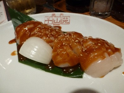 いつもは付け合わせが長ねぎだった気がするけど、今日は塩ミノを除いたすべての焼き物が玉ねぎだったな。