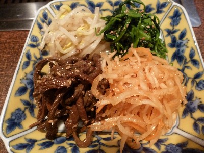 最初に運ばれてきたナムルは豆もやし、ほうれん草、ぜんまい、大根。