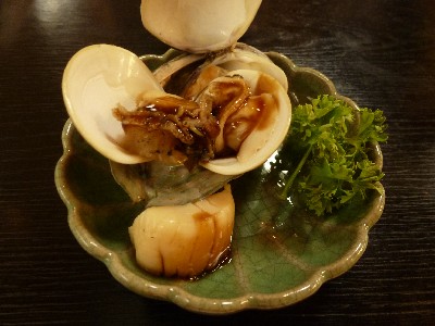 ハマグリ、ホタテ、アワビ(?)を蒸したものに甘ダレが絡めてあった。