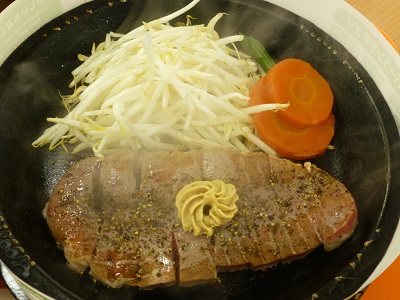 ちなみにステーキは表面がサッと焼いてある程度、もやしは生で乗ってた。